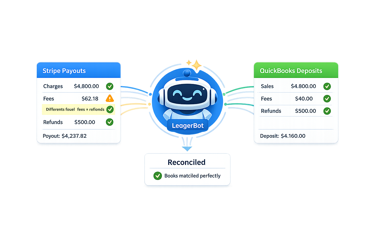 You know the answer is somewhere in the mix of Stripe processing fees, a refund you issued last Tuesday, and the timing of when charges were captured versus when Stripe actually paid you. But finding it means opening Stripe, cross-referencing each transaction, calculating the fees, checking for refunds, and then figuring out which QuickBooks entries are off.